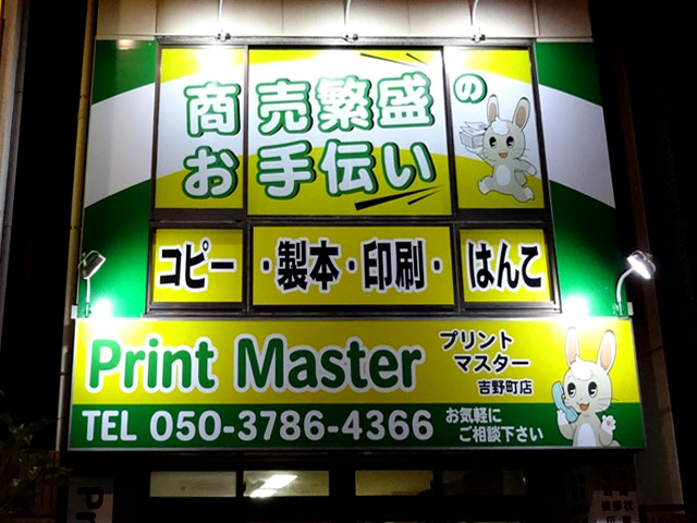 照式方式は、コンビニなどでよく見かけるのが、アクリル板やFFシートを使用して内側から蛍光灯やLEDで照らす「内照式」。 他に、アルミ板にインクジェットプリントフィルムを貼って外側からライトアップする「外照式」もあります。